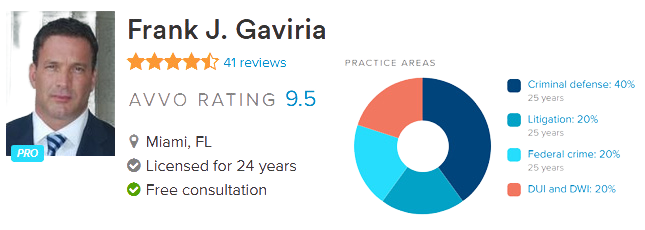 christos sifakakisTrustindex verifies that the original source of the review is Google. Frank is a skilled attorney. He was able to get my family member’s drug trafficking case dismissed!! He truly cared and fought hard! JenniferslnsTrustindex verifies that the original source of the review is Google. Frank is a great lawyer who took his time to correctly and professional take care of my Son’s case. I will recommend him to others not only because of his work ethic but because he saved my son’s life. Christian MojicaTrustindex verifies that the original source of the review is Google. Thank you so much Frank! You changed my life! I highly recommend Frank for his amazing work ethic, his loyalty, trust, and his excellent staff! Joel AlmanzarTrustindex verifies that the original source of the review is Google. I am beyond thankful for the services of Frank as my criminal defense lawyer. From the outset, it was evident that his expertise and professionalism were unparalleled. Frank's deep understanding of the law, coupled with his pragmatic and strategic approach, made my experience as painless as possible in what was an incredibly challenging time. Carlos GomezTrustindex verifies that the original source of the review is Google. Exceptional Criminal Attorney - A Lifesaver! I cannot recommend Frank Gavira highly enough for anyone in need of a top-notch criminal attorney. From the moment I contacted them, I felt understood and supported throughout the entire process. Mr Gaviria and his team are well-versed in the criminal justice system, tenacious in the courtroom, and incredibly compassionate with his clients. In what was an undeniably stressful period, Frank Gavira took charge of my case with confidence and expertise, ensuring the best possible outcome. Their skillful negotiation and strategic defense work led to immensely favorable results. If you ever find yourself in need of a criminal attorney, save yourself the stress and look no further than Frank and his team. Matthew LogmanTrustindex verifies that the original source of the review is Google. The best criminal lawyer in Miami. Jose PonceTrustindex verifies that the original source of the review is Google. The best lawyer you can have on your case , he will fight for you like no other attorney I'm satisfied with frank and his professionalism work ethics, he is the best attorney, no doubt. Thank you once again for being an amazing lawyer. Very grateful. I Will never forget how you helped me gain my freedom in a blink of an eye Justice is what we need and with frank you will forsure receive the justice we all deserve. "10" star rating.. !! Godbless everyone ! Kelsey BellTrustindex verifies that the original source of the review is Google. THANK YOU FRANK! I hired Frank and his team to take on my case once I realized my public defender was incompetent. Her lack of communication and action worried me greatly. The first day, Frank was filing motions in my behalf and one month later got both of my charges COMPLETELY DROPPED. I had two charges, one for unlawful discharge of a firearm in public and one for concealed carry without a permit but I never even had to see a court room. Thank you, Frank, for saving my reputation after Miami PD made the mistake of charging an innocent person. 10/10 recommend! Mark CoxTrustindex verifies that the original source of the review is Google. I was referred to frank by another attorney. I was charged with a violent crime , he handled it very professionally and filed a stand your ground motion and got the case dismissed. I would highly recommend him. Jonathan VargasTrustindex verifies that the original source of the review is Google. I was searching top criminal defense attorneys in Miami. I found Franks firm and was impressed by the experience and reviews. I called his office, his staff was friendly and knowledgeable. They set me up with a free consult immediately. I met Frank, he was knowledgeable and compassionate. He took the time to learn about the consequences of this case in my life and career. By some magic he was able to get the case completely dismissed. Saving my life, reputation, and job that I have worked so hard to achieve. Frank is the best!!!